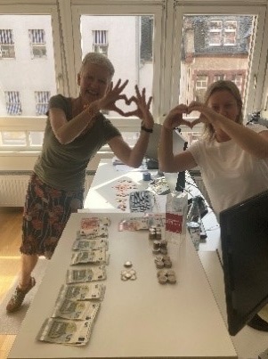Diese Herangehensweise machte sich im wahrsten Sinne des Wortes bezahlt, am Ende des Tages konnte die Spendenaktion mit einem gesammelten Betrag von 450 € als ein voller Erfolg betrachtet werden. Diese Spende wurde umgehend an Pro Asyl übergeben, auch die Mitarbeiterinnen waren vom Engagement der Schülerinnen und Schüler sehr angetan.